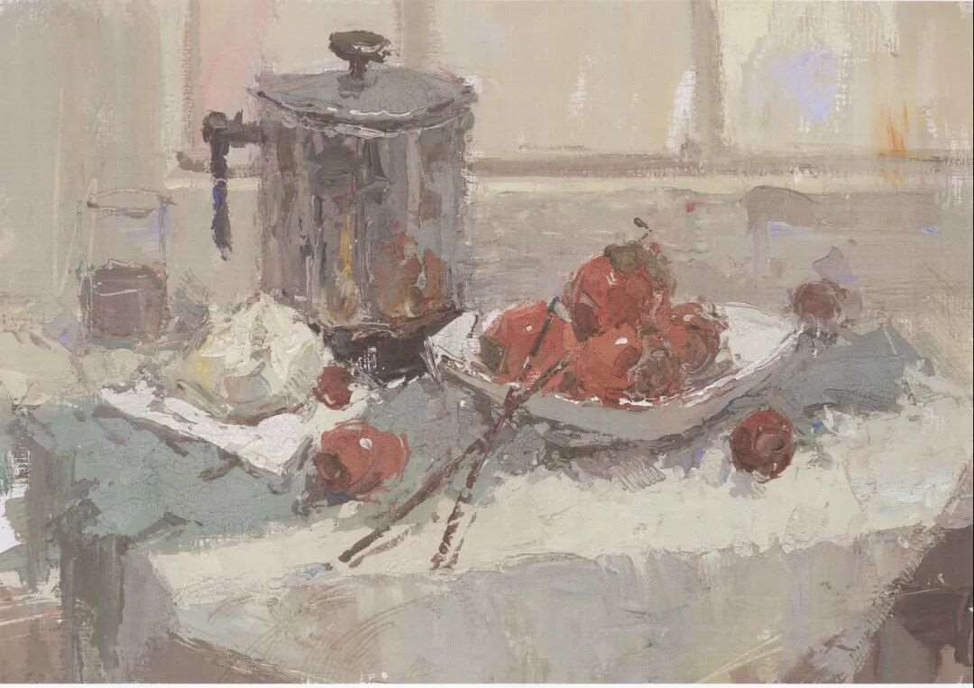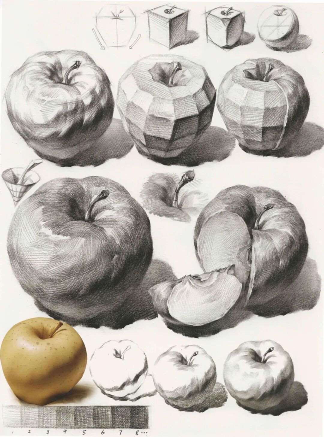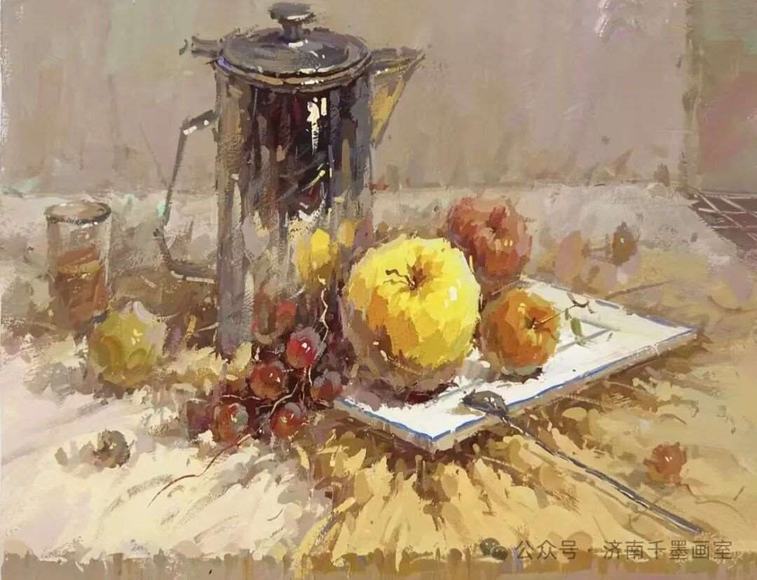 比如:处理好苹果的凹陷、对陶罐口的塑造、高光点的虚实、盘子厚度的刻画等。